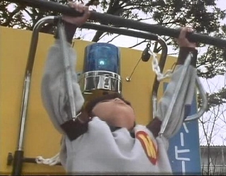 この回の伸介の扱いもすごい。プラスチックとは言え鎖で拘束、ネモトマンスタイルでは縛られてさんざんである。スーパーヒーロー養成ギプスで鍛えられてる時の伸介のしんどそうな声と汗びっしょりの顔のかわいいこと。