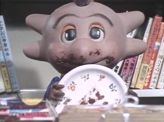 ところが当のカミタマン、伸介の部屋の物陰で、折しもパパのおみやげの残り物のおはぎを盗み食いしている最中だったのだ。