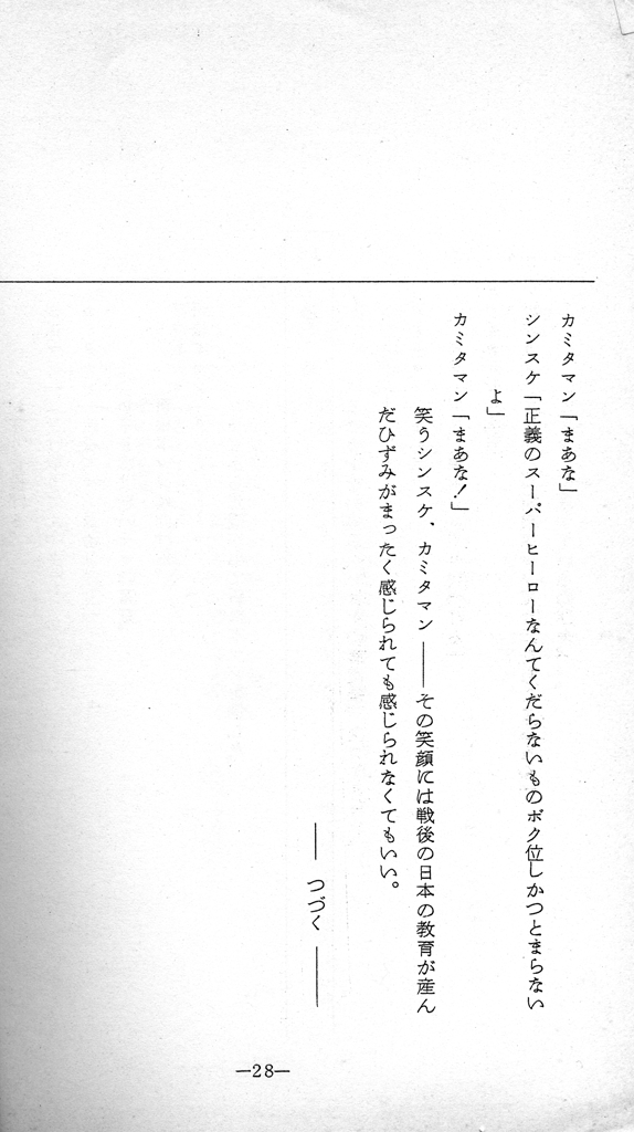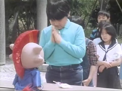 倒れ伏して泣いていたカミタマンを見つけた伸介は、最初茶化し気味だったが、様子が変なのに気づいて口をつぐんだ。