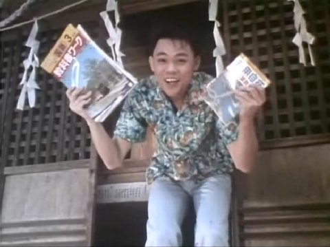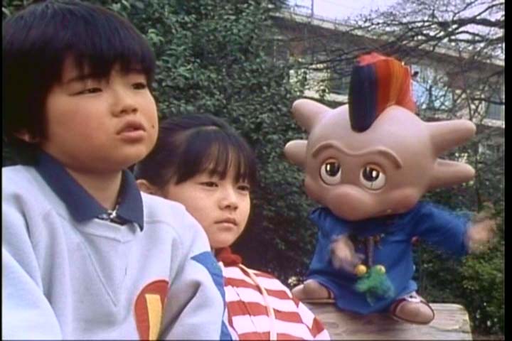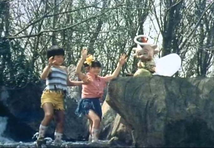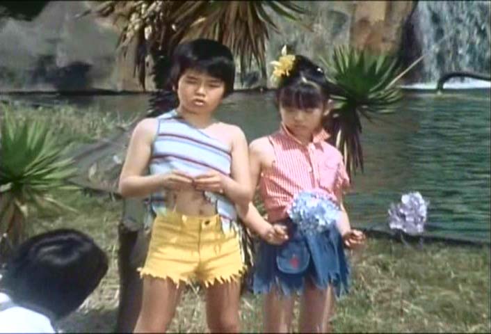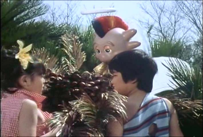 南国に漂流した少年少女のイメージか、恥ずかしい格好をさせられた伸介とマリ。ぶうぶう言ってはいるが、撮影が始まるとノリノリ。天使の輪や羽で仮装させられたカミタマンも、二人のおだてにのって気を取り直し、撮影は進んだ。